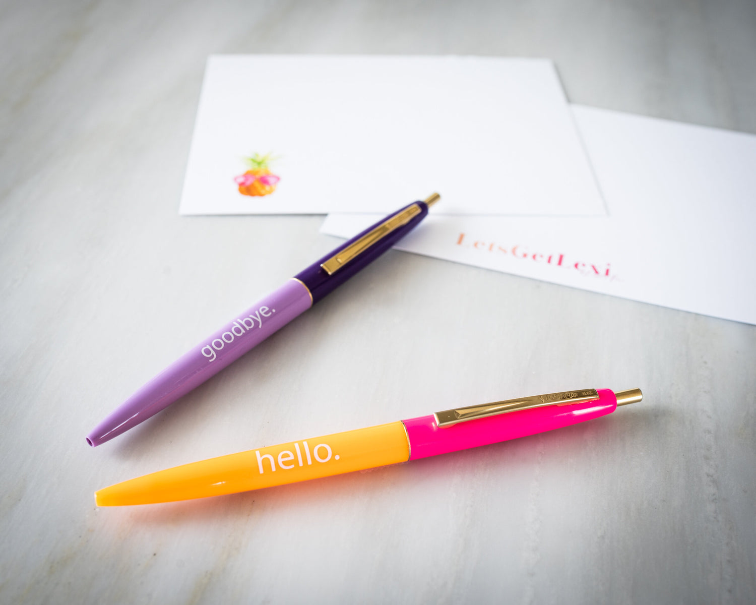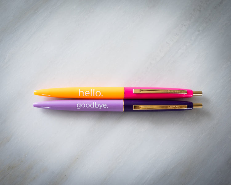 This set of two (one Hello x one Goodbye) pens are inspired by LetsGetLexi: her love of bright colors, cheerful spirit, and love of a good black-inked pen.